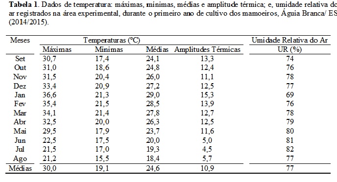 A doença fúngica conhecida como varíola ou pinta preta é um dos principais entraves para a produção comercial do mamão (Carica papaya) nas regiões tropicais e subtropicais do planeta. Sua alta incidência em lavouras comerciais ou domésticas, além de promover a queda prematura de folhas, provoca danos na superfície dos frutos, afetando, com isso, a qualidade dos mesmos. Apesar da importância, raros são os estudos com informações seguras de como os fatores climáticos atuam na sua epidemiologia. A obtenção de informações sobre os efeitos das variáveis climáticas sobre as doenças é indispensável para recomendar o manejo racional destas. Assim, num experimento com diferentes densidades de cultivo orgânico do mamoeiro, montado no Espírito Santo, grande produtor de mamão do Brasil, registrou-se através de uma microestação meteorológica, desde o transplantio, os valores diários das Temperaturas e da Umidade Relativa do Ar. Os valores foram confrontados para os meses de abril, maio, junho, julho e agosto de 2015, quando ocorreu a incidência natural da varíola nos mamoeiros. Para estabelecer as análises, adotaram-se notas de severidade da doença. As diferentes densidades de cultivo adotadas foram: (D1) 1667, (D2) 2167, (D3) 2667, (D4) 3167, (D5) 3667 e (D6) 4167 plantas por hectare. Os resultados apontaram que a maior severidade da doença ocorre numa combinação de maiores Amplitudes Térmicas, média das Temperaturas Máximas variando de 28 a 300C, média das Temperaturas Mínimas próximas de 20 0C, com Umidade Relativa do Ar próxima de 80%; e ainda, mais favorecida pelo maior adensamento de cultivo.