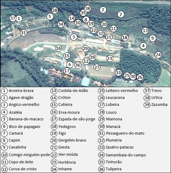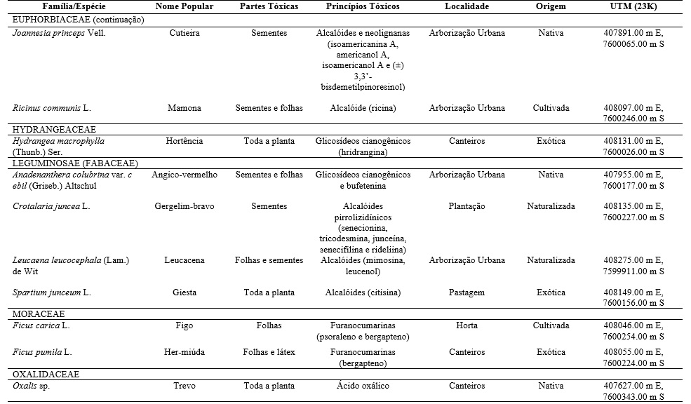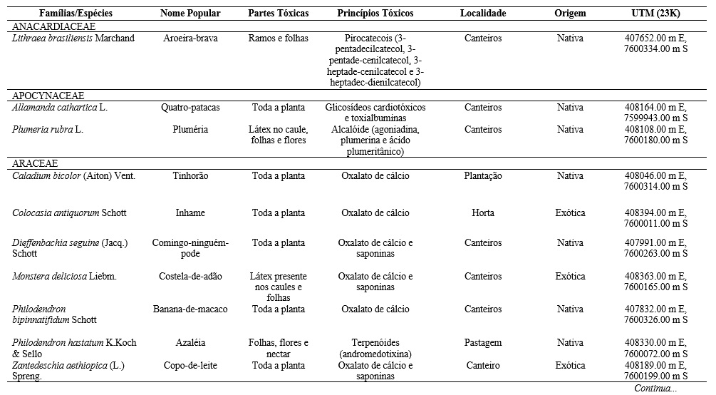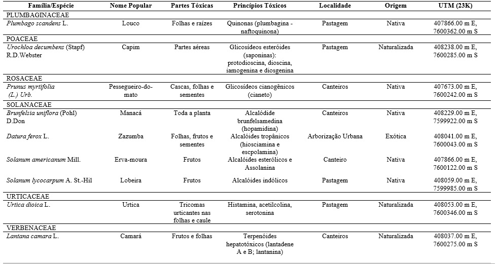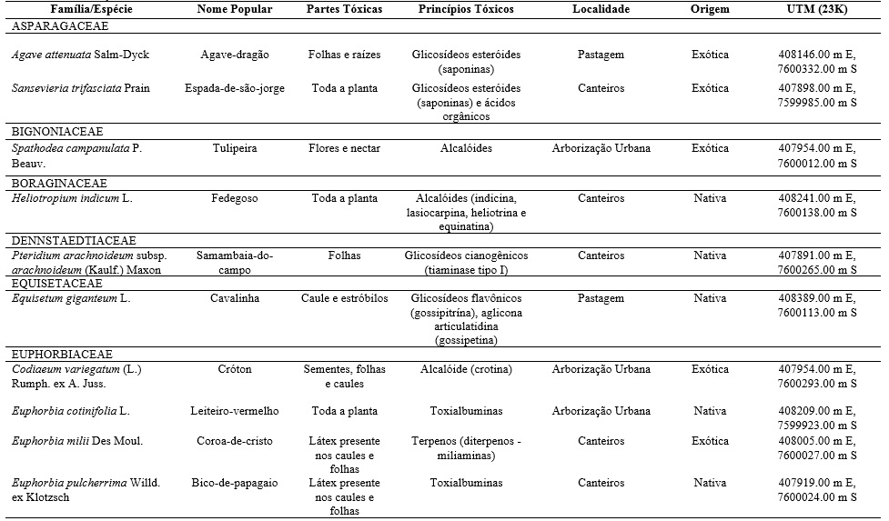 das espécies encontradas nas áreas urbanizadas do Campus. Foram identificadas, registradas e georreferenciadas 39 plantas tóxicas pertencentes a 19 famílias botânicas, assim como seus nomes populares e princípios tóxicos.