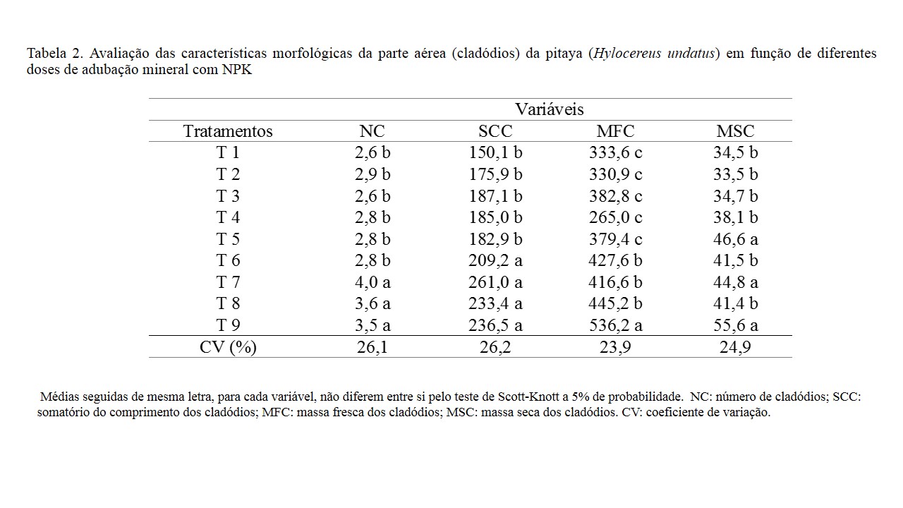 MOREIRA, R.A.M.; CRUZ, M.C.M.; FERNADES, D.R.; SILVA, E.B.; OLIVEIRA, J. Nutrient accumulation at the initial growth of pitaya plants according to phosphorus fertilization. Pesquisa Agropecuária Tropical, Goiânia, v. 46, n. 3, p. 230-237, set. 2016.