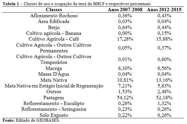 The objective of the research was to evaluate land use and occupation in the Fundaça Stream subbasin, state of Espírito Santo, Brazil, aiming at subsidizing improvements in environmental conservation and territorial planning. The procedures were performed in the ArcGIS® computer program. First, the study defined the limits of the subbasin, and then obtained the features of land use and occupation for the state of Espírito Santo from two mappings, from 2007 to 2008, and from 2012 to 2015. These features were edited, defining the classes of use and occupation only for the subbasin. They were identified, quantified, and mapped. There is a predominance of pasture, with percentages above 50 %, although this occupation decreased by 1.94 % between the periods studied. Coffee growing, the third predominant class, also decreased, which can be attributed to the preference for other activities, such as eucalyptus forestry. This showed strong growth, although with even lower percentages. Mishandling of those areas can cause environmental and economic damage. However, the areas of native vegetation represented a minimal rate, even with an increase, due to the decrease of vegetation in the early stage of regeneration. Macega (wild vegetation) coverage, besides being close to the native vegetation and which was predominantly fragmented, indicates problems with the use and occupation planning. The action of the local riverbasin committee and public managers, besides environmental education, and correct management of rural activities, are necessary actions.Arquivos adicionais