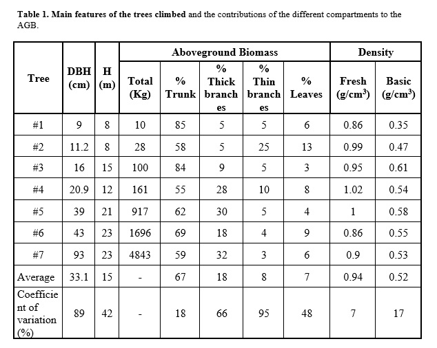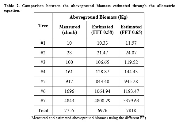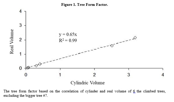 Carbon sequestration is a crucial ecosystem service, naturally mitigating and reducing the ever-growing threat from climate change. Large forests, such as the Atlantic Forest, are important carbon reservoirs removing carbon from the atmosphere and storing it in their biomass. The assessment of carbon stock from forests fragments helps to establish a better understanding of the carbon cycle and the potential of climate mitigation strategies. Thus, we estimated the biomass and carbon stock of an Atlantic Forest fragment located in the foothills of Pedra de Itaocaia. We used a non-destructive methodology based on climbing techniques and an allometric equation. We climbed seven trees in order to thoroughly measure them in whole and calculate the volume of arboreal compartments. We compared the measured volume obtained from the climb to an estimated tree cylindrical volume and established a correction factor of 0.65 between both (i.e. tree form factor). The tree form factor adjusts the allometric equation and allows carbon estimations without the need to climb all trees in the fragment. The biomass and carbon stock estimates obtained were 100.1 and 50.5 MgC/ha, respectively, which implies that the fragment is on an intermediary stage of regeneration at approximately forty years old. This allometric equation efficiently integrates structural features of forest fragments similar to the one of Pedra de Itaocaia, thus contributing to advance the knowledge about processes taking place in forest fragments situated in the Atlantic Forest. Carbon estimation is imperative for a better understanding of climate mitigation strategies that can revert the threat of climate change to ecosystems.Referências