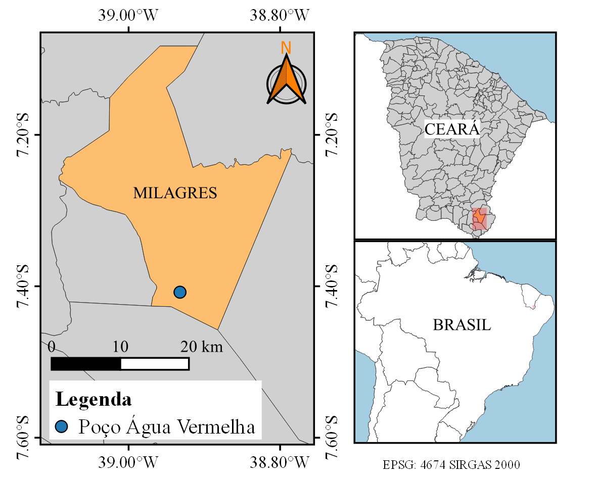 - Figura 1 – Mapa de localização do município de Milagres, Ceará, com destaque para a localização do poço Água Vermelha, 2021