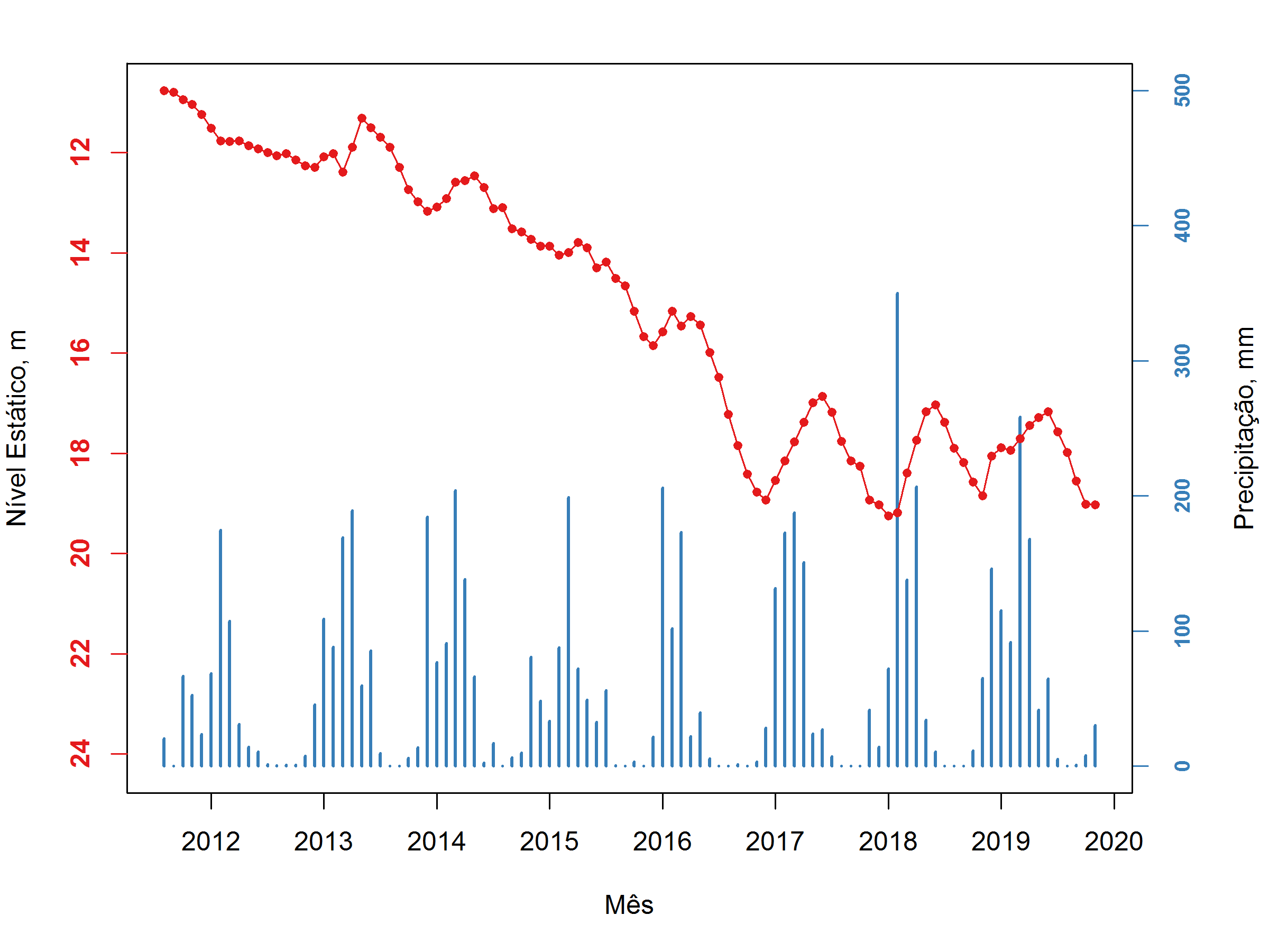 - Figura 3 – Comportamento do nível estático médio mensal no poço Água Vermelha vs. Precipitação na área de estudo, no período de agosto/2011 a novembro/2019