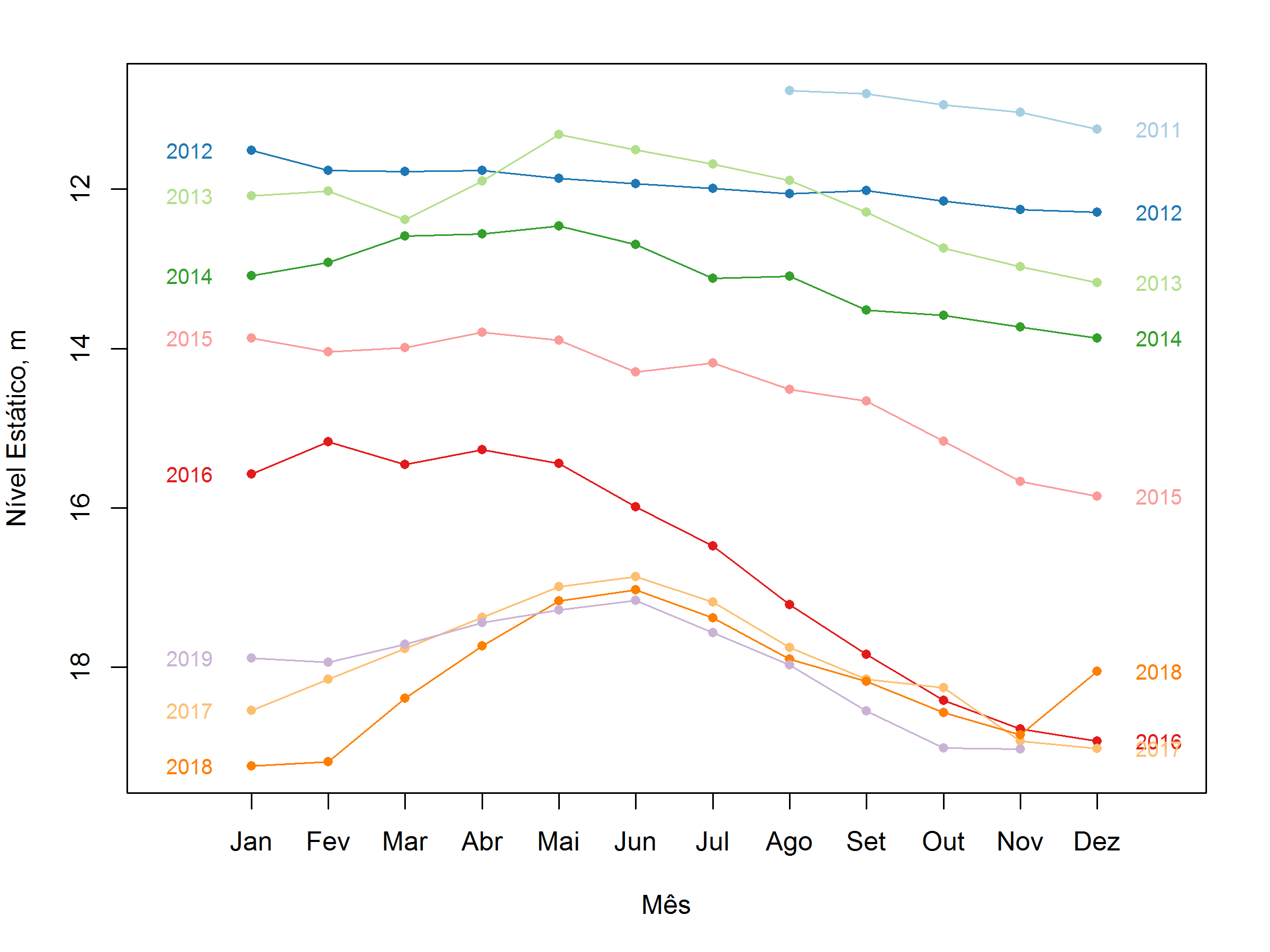 - Figura 4 – Gráfico de sazonalidade da série mensal do nível estático médio no poço Água Vermelha, no período de agosto/2011 a novembro/2019