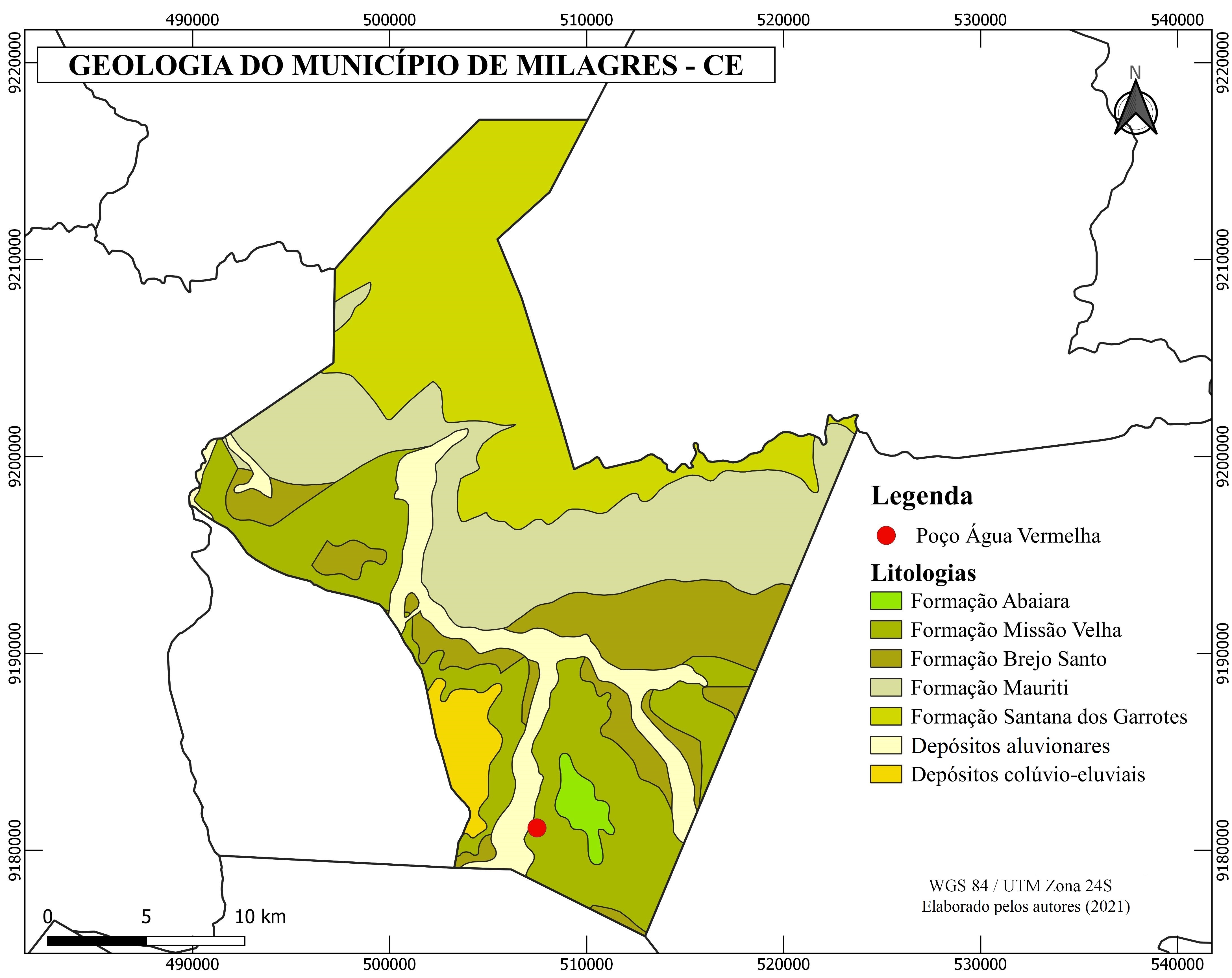 - Figura 7 – Mapa geológico do município de Milagres, Ceará, com destaque para a localização do poço Água Vermelha, 2020
