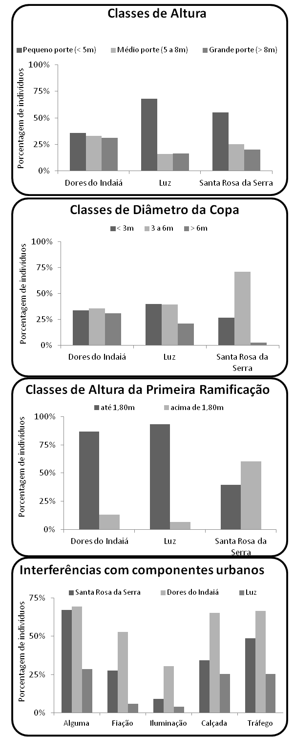 Um inventário da arborização urbana é passo essencial para a construção de uma proposta de manejo de sucesso. Nesse sentido, o objetivo desse trabalho foi realizar um inventário qualiquantitativo comparativo de três áreas distintas de três cidades do Alto São Francisco em Minas Gerais: Dores do Indaiá, Luz e Santa Rosa da Serra. Foram selecionadas três áreas e realizado um inventário total dessas áreas. Foram inventariados 429 indivíduos de 40 espécies e 29 famílias botânicas. A maioria das espécies utilizadas é exótica, porém as espécies mais abundantes nas cidades, S. mole e B. forficata, são nativas. A densidade de árvores foi considerada baixa e sua diversidade foi, em geral, acima da média de outros estudos de arborização. Todas as cidades analisadas mostraram uma distribuição desigual de árvores sendo que as três espécies mais abundantes chegavam a representar mais de 50% da arborização viária. Além disso, Santa Rosa da Serra mostrou um alto índice (60%) de espécies representados por apenas um indivíduo. As arborizações mais recentes (Luz e Santa Rosa da Serra) mostraram mais influência da população (presença de frutíferas), árvores de menor porte e menos conflitos com outros componentes urbanos. O porte maior das árvores em Dores do Indaiá, estava ligado à maior frequência de interferências nessa cidade. O porte das árvores esteve relacionado também à idade da arborização. Apesar de suas peculiaridades, as três cidades enfrentam problemas comuns com suas arborizações e foi sugerido que um consórcio possa ser criado para a implementação de novas políticas públicas nessa área.Downloads