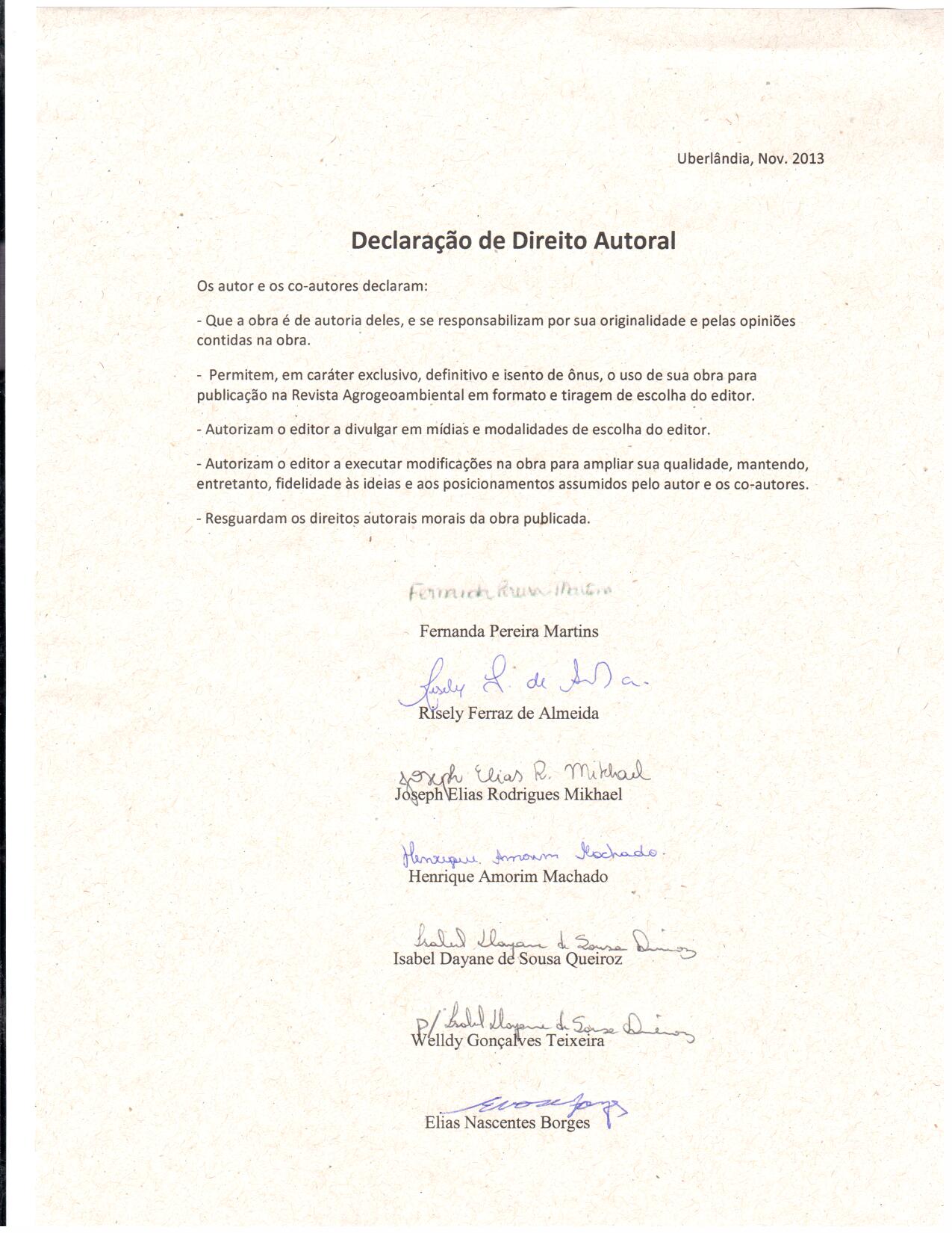 A submissão de artigos e demais obras de comunicação científica para a Revista Agrogeoambiental implica plena aceitação pelo autor e pelos coautores da política de direitos autorais abaixo: