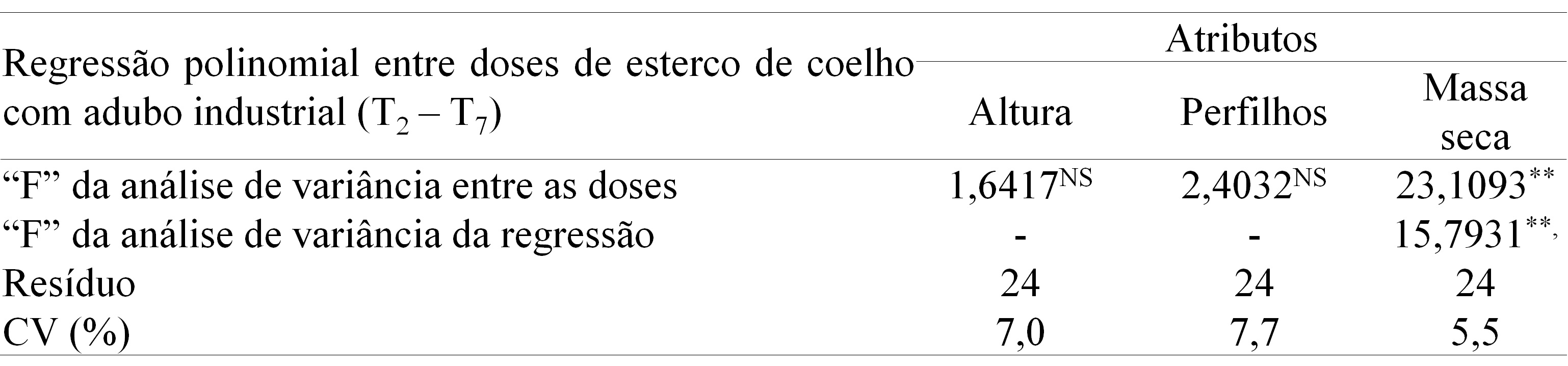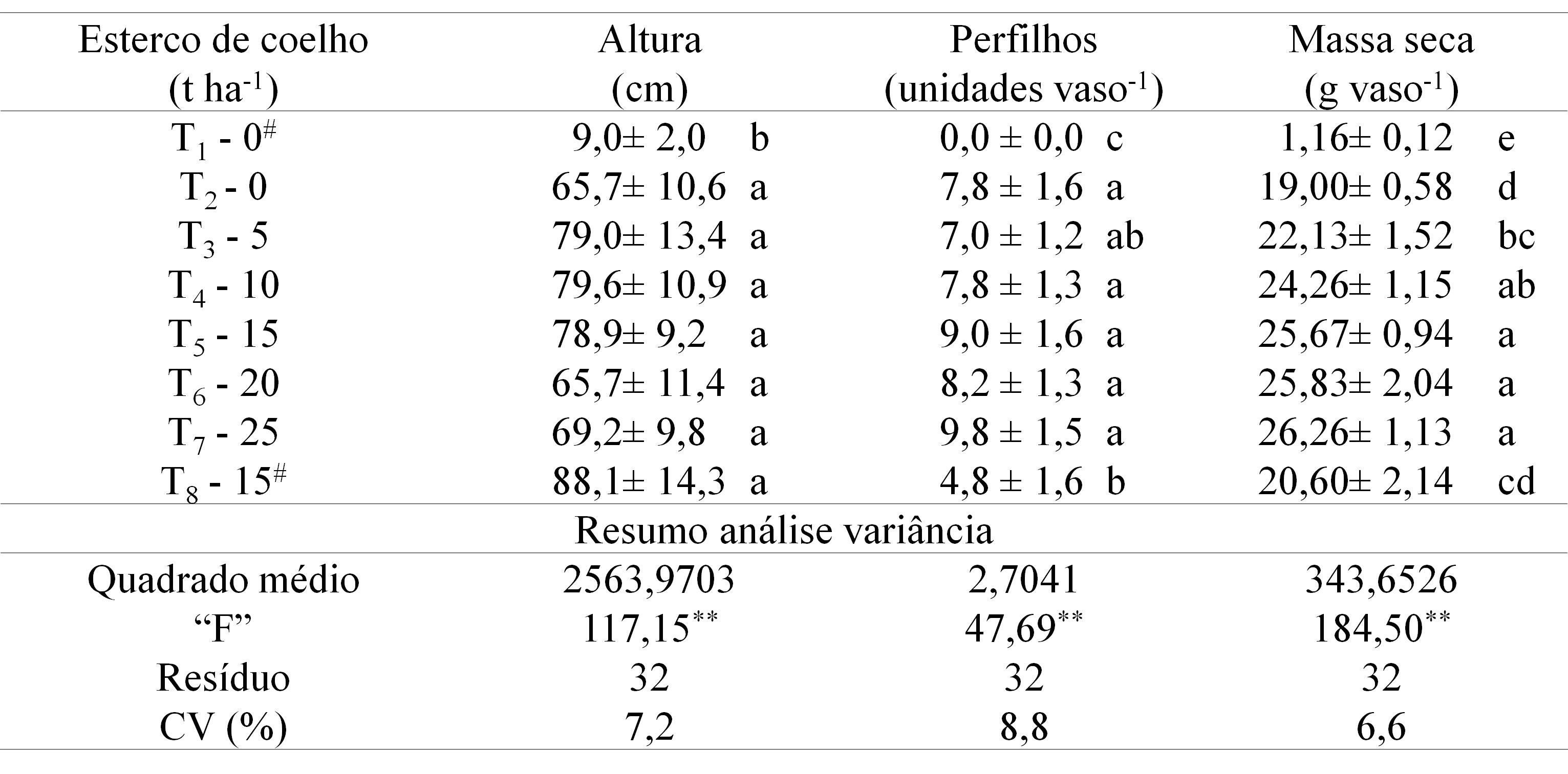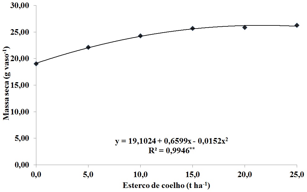 Os resíduos ou adubos orgânicos aplicados ao solo são fontes de matéria orgânica o que promove melhoria em propriedades físicas e químicas do solo, aumentando a sua capacidade produtiva. O objetivo deste trabalho foi avaliar a eficiência agronômica do esterco de coelho, combinado com e sem adubo industrial, em milheto. O experimento foi conduzido em vasos, em ambiente protegido, e o delineamento experimental foi o inteiramente casualizado com 8 tratamentos e 5 repetições. Os resultados mostraram que o uso concomitante de adubo industrial[1] e de esterco de coelho promoveu aumento do perfilhamento, da altura de plantas e produção de massa seca de milheto. Houve aumento na produção de massa seca quando adubo industrial (nas doses 40 kg ha-1 N, 400 kg ha-1 P2O5 and 50 kg ha-1 K2O) foi combinado com esterco de coelho, até a dose de 21,7 t ha-1[1] Neste trabalho o termo “adubo industrial” refere-se aos adubos sintéticos, fontes de N, P e K na forma mineral e orgânica, produzidos industrialmente.