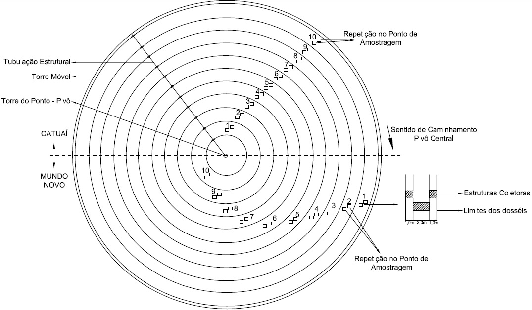 O pivô central é um sistema de irrigação que possibilita a aplicação de água em toda a área plantada. A observação do funcionamento de um pivô central convencional em campo, ao irrigar uma lavoura de cafeeiros adultos, possibilitou identificar um acúmulo de água nas extremidades dos dosséis das plantas em detrimento da região central das entrelinhas. Este trabalho teve como objetivo comprovar a influência do cafeeiro na interceptação da lâmina de irrigação aplicada por meio de um pivô central convencional, o que foi denominado pelos autores de “efeito sombra”. Além disso, o trabalho buscou constatar a possibilidade de economia de recursos hídricos e de energia em função do “efeito sombra”. O experimento foi realizado em uma área de 115,33ha plantada com duas cultivares do cafeeiro arábica (Cofeea arabica) onde foi coletada água aspergida pelo pivô central sob o dossel das plantas e nas entrelinhas. Os dados foram analisados estatisticamente por meio de análise descritiva e análise de variância, utilizando-se o software Action®. Os resultados mostraram que as lâminas médias coletadas sob os dosséis foram maiores do que as lâminas médias coletadas nas entrelinhas para ambas as cultivares, e a lâmina interceptada pelo cafeeiro foi, em média, 30,4% maior que a lâmina real aplicada pelo equipamento, comprovando-se o “efeito sombra” e, portanto, a possibilidade de economia de recursos hídricos e de energia.