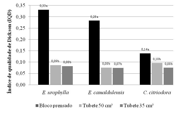 - Índice de qualidade de Dickson (IQD) das mudas de Eucalyptus urophylla, E. camaldulensis, e C. citriodora, produzidas em blocos prensados e tubetes de 50 e 35 cm3.