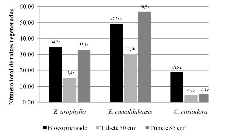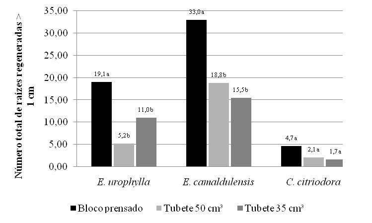 - Figura 3 - Valores médios do número total de raízes regeneradas maiores de 1 cm de mudas de Eucalyptus urophylla, E. camaldulensis e C. citriodora, produzidas em blocos prensados e tubetes de 50 e 35 cm3.