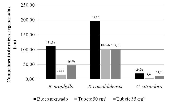 - Figura 4 - Valores médios do comprimento das raízes regeneradas de mudas de Eucalyptus urophylla, E. camaldulensis e C. citriodora, produzidas em blocos prensados e tubetes de 50 e 35 cm3.