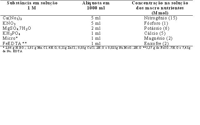 - Tabela 1 - Composição da solução hidropônica e concentrações de micro e macro nutrientes, visando o desenvolvimento do sistema radicial das mudas de Eucalyptus urophylla, E. camaldulensis, e Corymbia citriodora