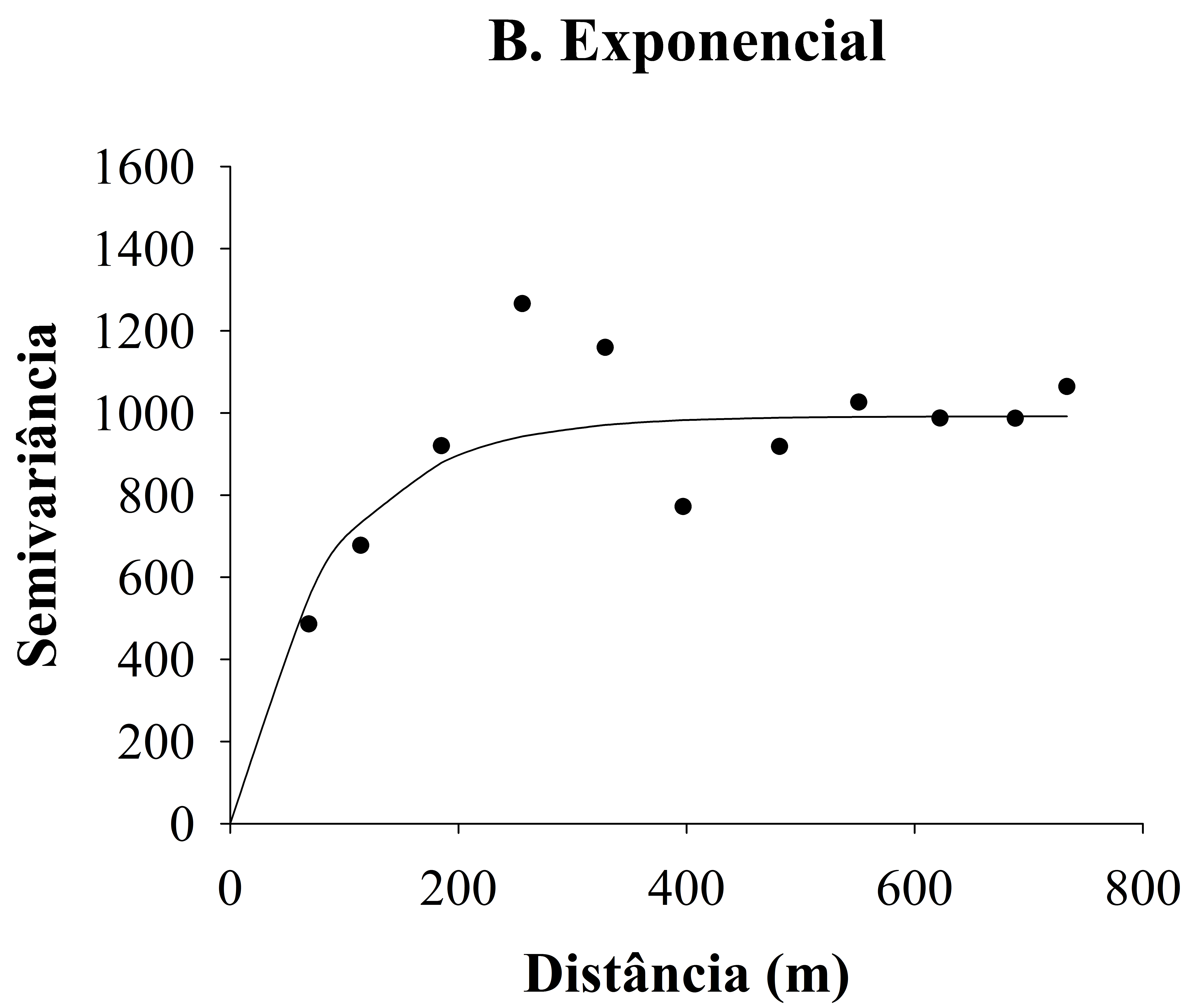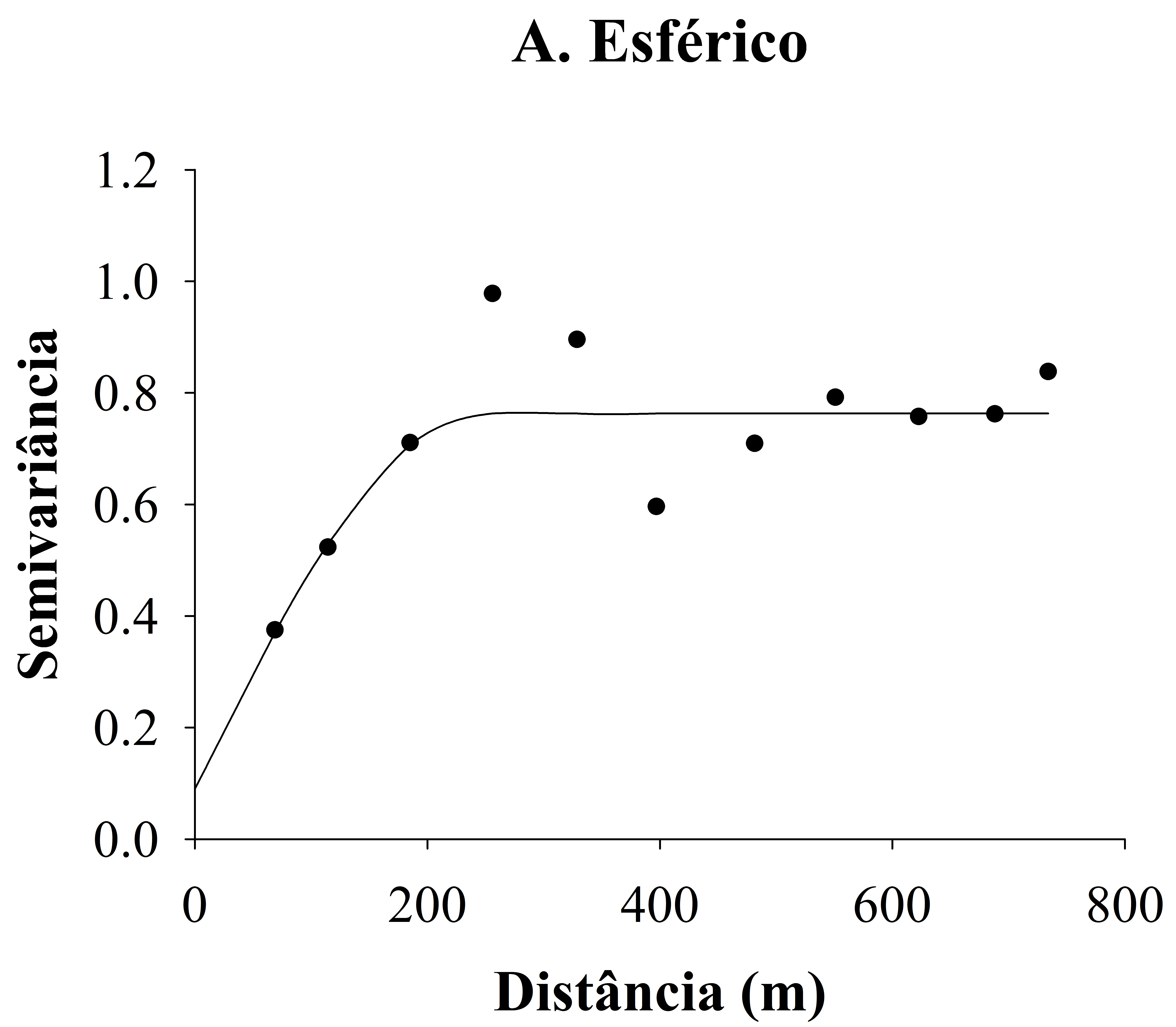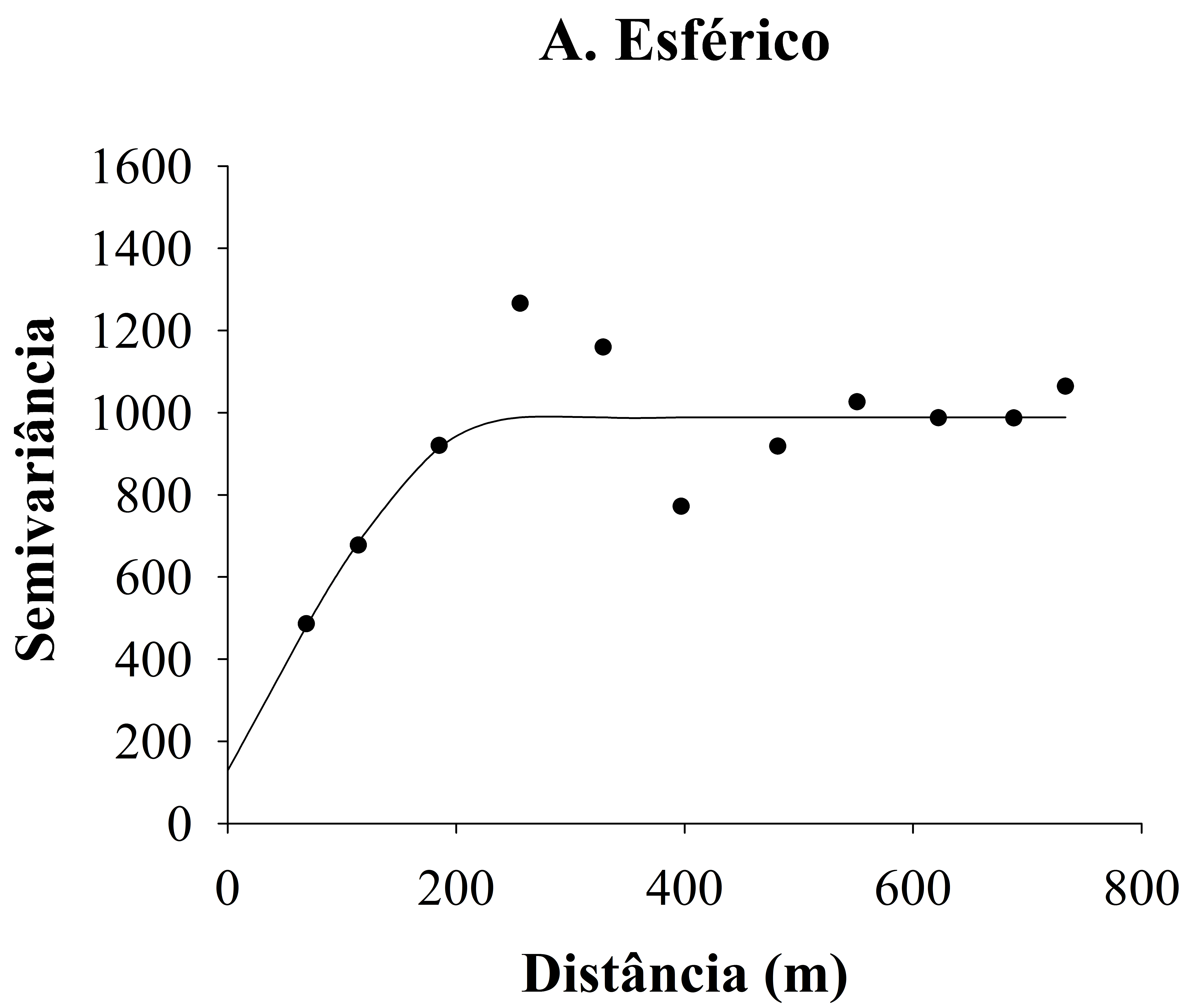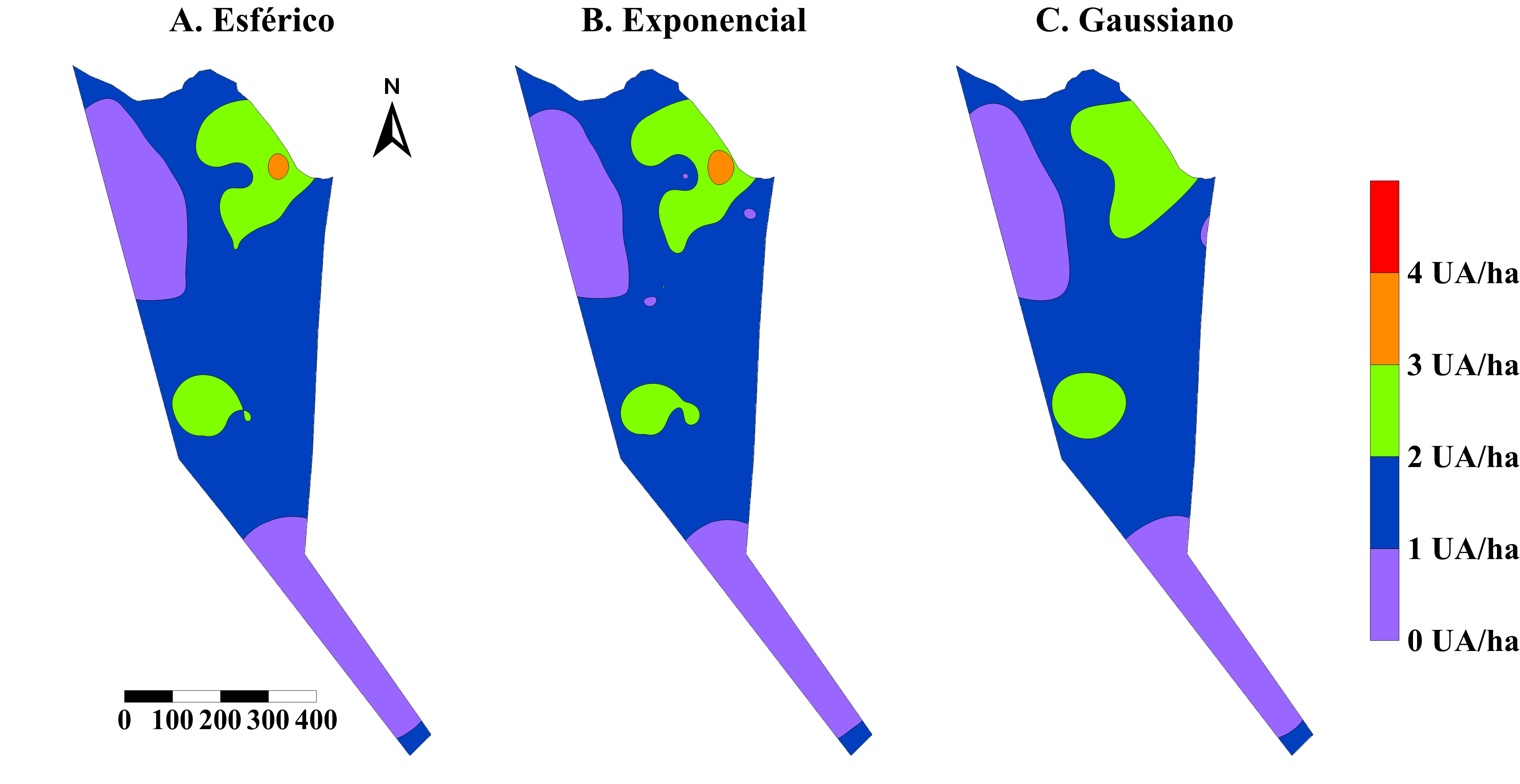 O objetivo deste estudo foi realizar a modelagem variográfica da disponibilidade de matéria seca da Urochloa brizantha cv. Marandu e a simulação da taxa de lotação animal por meio do ajuste dos modelos esférico, exponencial e gaussiano ao semivariograma experimental, bem como a robustez das predições. A biomassa da gramínea foi coletada em 50 pontos em uma área de 36,22 ha. A simulação da taxa de lotação foi realizada com base na disponibilidade de folhas verdes em cada ponto amostrado, consumo diário de matéria seca por cada unidade animal (UA) e o tempo de pastejo. Os dados referentes às variáveis foram submetidos à análise descritiva, estudo geoestatístico e interpolação por krigagem ordinária. A modelagem variográfica da disponibilidade de matéria seca do capim marandu e a taxa de lotação foram caracterizadas pelos modelos esférico, exponencial e gaussiano. Entretanto, apesar da aparente precisão dos ajustes, o modelo esférico apresentou melhor inferência, segundo o critério de informação de Akaike e soma dos erros ao quadrado. Assim, a adoção de modelos com ajustes de critérios somente visuais levam a estimativas da disponibilidade de biomassa de forragem e da taxa de lotação animal que não refletem a realidade da área.