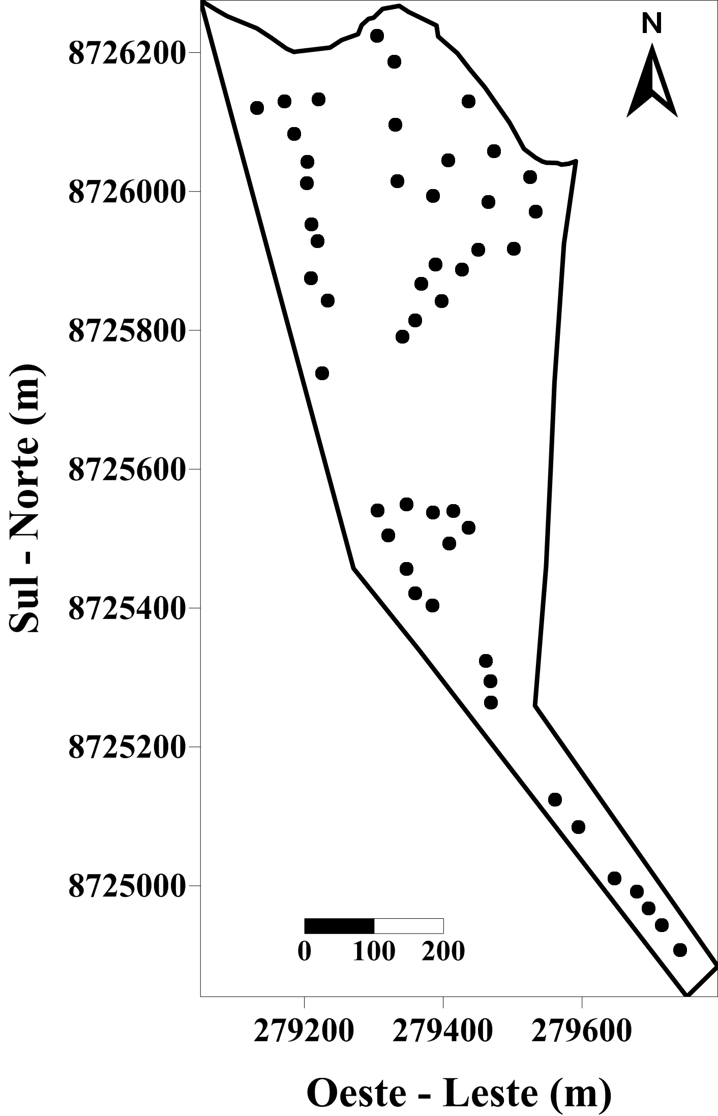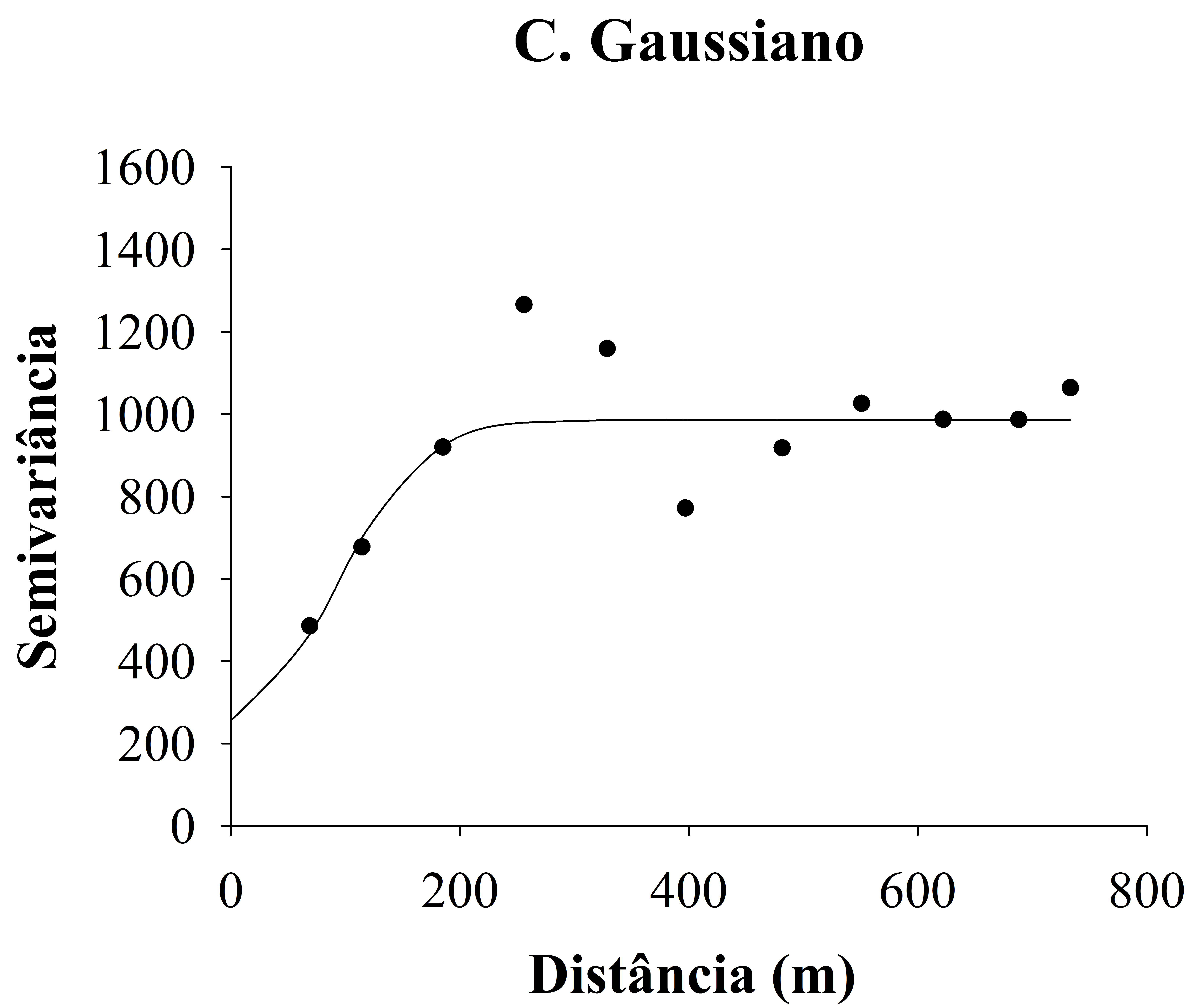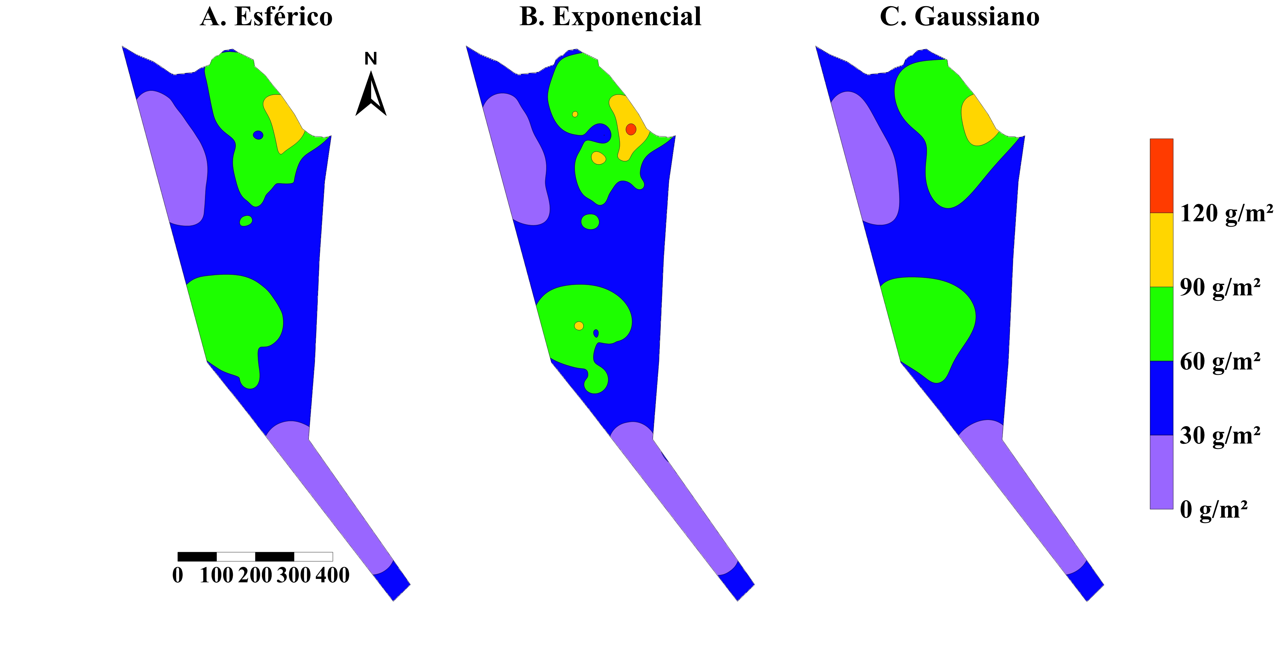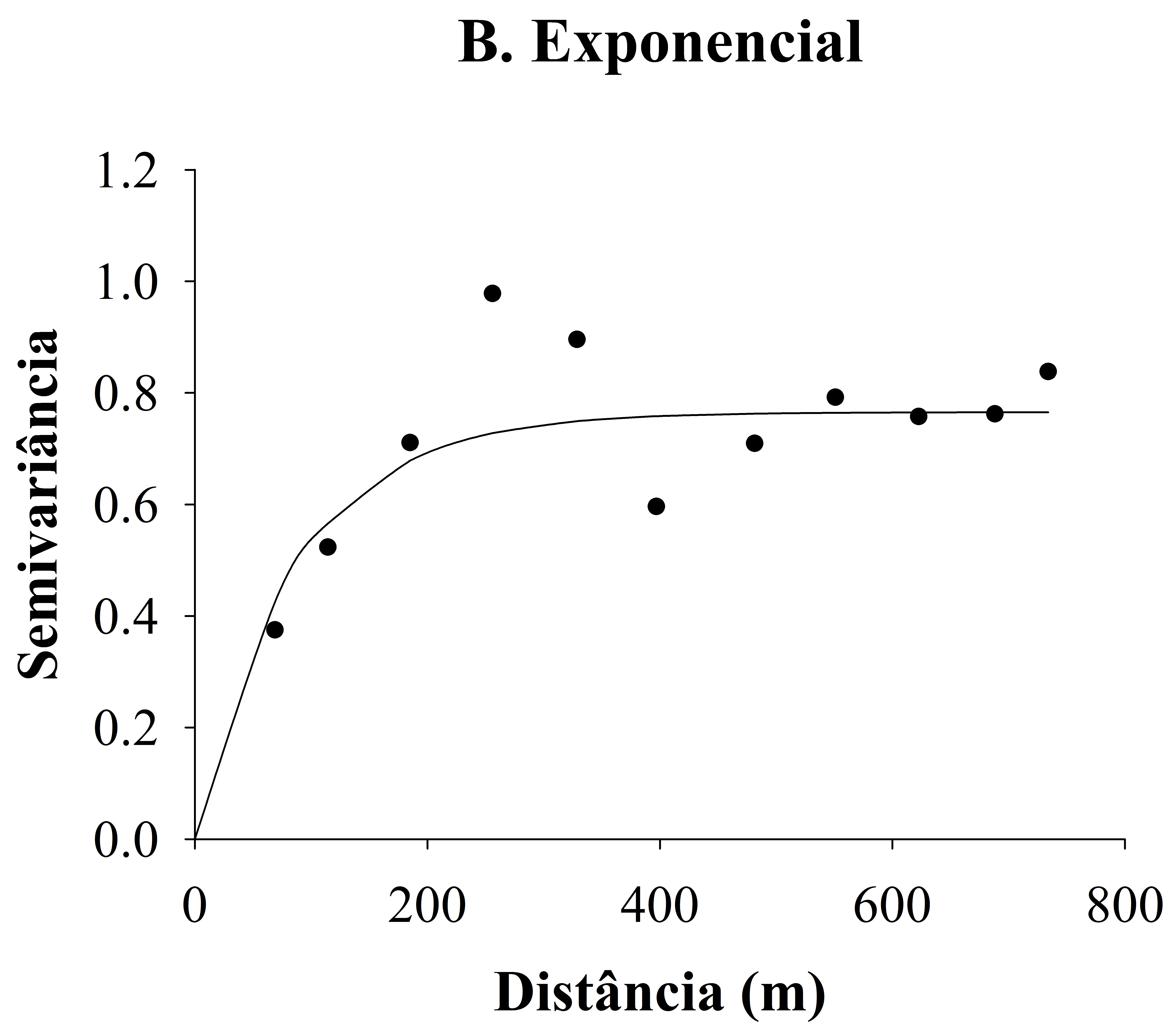 O objetivo deste estudo foi realizar a modelagem variográfica da disponibilidade de matéria seca da Urochloa brizantha cv. Marandu e a simulação da taxa de lotação animal por meio do ajuste dos modelos esférico, exponencial e gaussiano ao semivariograma experimental, bem como a robustez das predições. A biomassa da gramínea foi coletada em 50 pontos em uma área de 36,22 ha. A simulação da taxa de lotação foi realizada com base na disponibilidade de folhas verdes em cada ponto amostrado, consumo diário de matéria seca por cada unidade animal (UA) e o tempo de pastejo. Os dados referentes às variáveis foram submetidos à análise descritiva, estudo geoestatístico e interpolação por krigagem ordinária. A modelagem variográfica da disponibilidade de matéria seca do capim marandu e a taxa de lotação foram caracterizadas pelos modelos esférico, exponencial e gaussiano. Entretanto, apesar da aparente precisão dos ajustes, o modelo esférico apresentou melhor inferência, segundo o critério de informação de Akaike e soma dos erros ao quadrado. Assim, a adoção de modelos com ajustes de critérios somente visuais levam a estimativas da disponibilidade de biomassa de forragem e da taxa de lotação animal que não refletem a realidade da área.