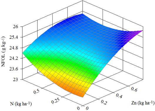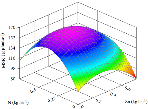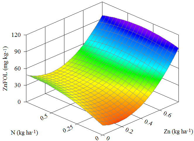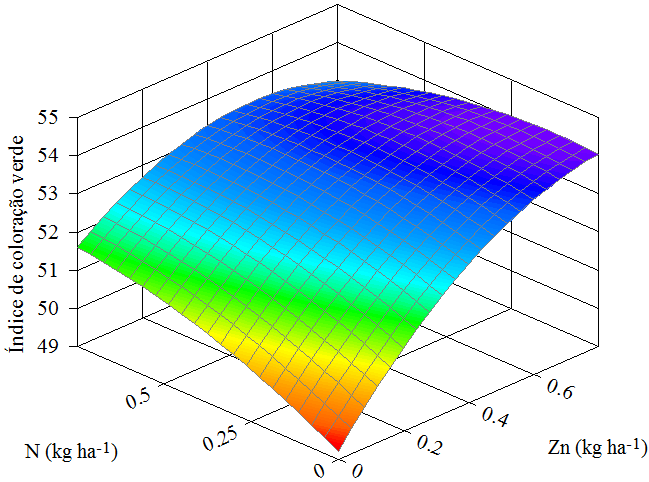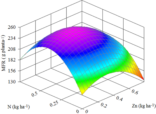 Objetivou-se avaliar a produtividade de milho (Zea mayz L.) “safrinha” no município de Confresa (MT) em função da pulverização foliar com nitrogênio e zinco. O delineamento experimental utilizado foi o de blocos casualizados dispostos em esquema fatorial 4 x 4 em 4 repetições, totalizando 64 parcelas. Os tratamentos estatísticos foram 4 doses de nitrogênio (0,00; 0,25; 0,50; 0,75 kg ha-1) e 4 doses de zinco (0,00; 0,40; 0,60; 0,80 kg ha-1). As características do milho avaliadas foram matérias frescas e secas das partes aérea (MFPA e MSPA) e raiz (MFR e MFPA), teor foliar de zinco (ZnFOL) e nitrogênio (NFOL), índice de coloração verde foliar (ICV) e produtividade de grãos (PRODU) de milho. Os dados obtidos das características avaliadas foram submetidos à análise de variância (ANAVA) da regressão experimento. Das características com valor de F da ANAVA significativo a 5 % de probabilidade foram obtidos os modelos de regressão linear múltipla. Foi observado elevação dos valores de ZnFOL e NFOL, o que influenciou a elevação dos valores de ICV. Tais características também influenciaram os valores de MFR e MSR, sendo os maiores observados nos teores de ZnFOL e NFOL dentro das suas faixas de suficiências. Não houve relação direta entre o melhor desenvolvimento da planta de milho e produtividade de grãos com os teores de ZnFOL. O valor de NFOL observado na maior produtividade de grãos de milho corroborou a literatura citada.
