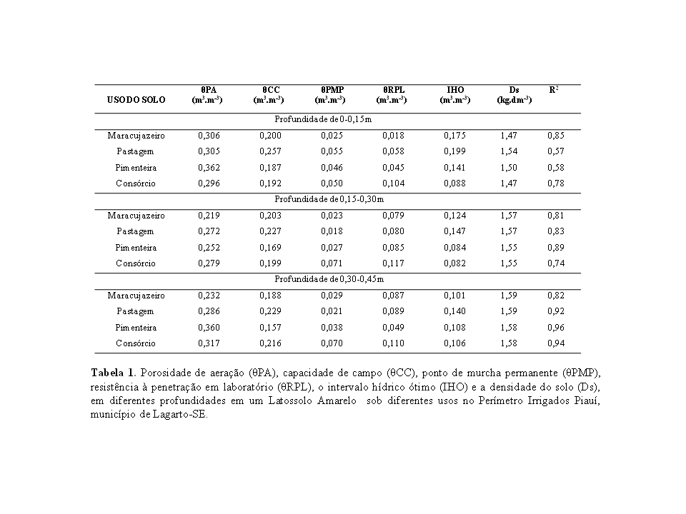 - Tabela 1. Porosidade de aeração (θPA), capacidade de campo (θCC), ponto de murcha permanente (θPMP), resistência à penetração em laboratório (θRPL), o intervalo hídrico ótimo (IHO) e a densidade do solo (Ds), em diferentes profundidades