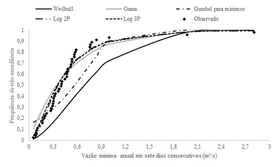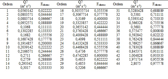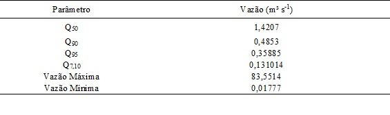 O estudo do comportamento da vazão de um curso d’água é de suma importância para se prever épocas de secas e cheias, implementar planos de gestão dos recursos hídricos, incluindo a outorga, além de dar subsídios ao dimensionamento de obras hidráulicas. Portanto, o presente trabalho executou um estudo estatístico das vazões médias mínimas de sete dias consecutivos anuais (Q7) e da curva de permanência de vazões do Rio São Miguel, em Arcos (MG). A série histórica de vazão foi obtida no banco de dados Hidroweb, gerido pela Agência Nacional das Águas. Os dados avaliados contemplaram os anos civis entre 1968 e 2014, com exceção dos anos de 1991, 1992, 2009 e 2012, devido aos dados de vazões desses anos estarem incompletos. Foram ajustadas as Funções Cumulativas de Probabilidade modelos log-Normal 2 parâmetros, log-Normal 3 parâmetros, Gumbel para mínimos, Weibull e Gama para Q7; a aderência dessas funções aos dados observados foi testada usando os testes de Kolmogorov-Smirnov e Qui-Quadrado. Pelos testes de Kolmogorov-Smirnov e Qui-Quadrado, o modelo Log-Normal a 2 parâmetros foi o que melhor aderiu à série de Q7. O valor obtido de Q7,10 foi de 0,131014 m³ s-1, enquanto que os valores de Q50, Q90 e Q95, estimados a partir da curva de permanência, foram 1,4207 m³ s-1, 0,4853 m³ s-1 e 0,35885 m³ s-1.